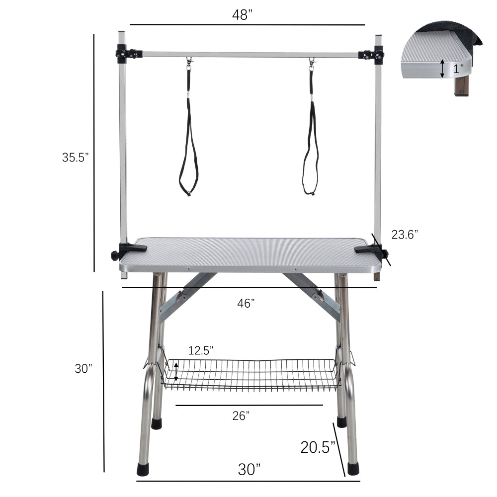 46" Folding Dog Pet Grooming Table Stainless Steel Frame Rubber Mat on Board with Adjustable Arm and Clamps pet dog Cat Grooming Table (SILVER-GRAY COLOR)