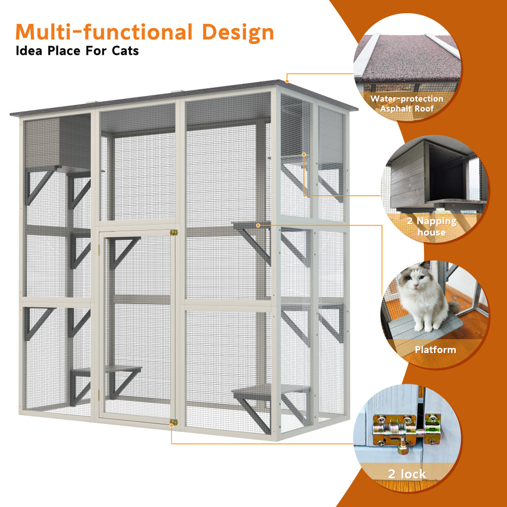 Gray Wooden Outdoor Catio Cat Enclosure with Weatherproof Asphalt Roof, Large Walk-in Cat House with 6 Platforms & 2 Napping Boxes, Solid Wood Cat Cage Kennel Condo Playpen for Patio