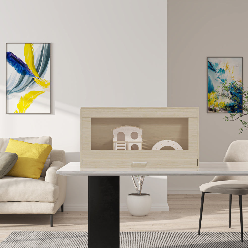 The pull-out drawer design makes our hamster cage easier to clean. Before pulling the drawer out, you need to first remove the hamster and the hamster cage decoration house inside, then pull the drawer out and thoroughly clean.