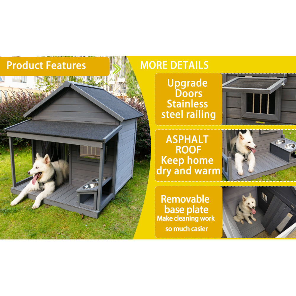 Large balcony dog house, length 44.2" x width 44.6 "x height 44.6" Solid wood asphalt roof dog house with large terrace, weatherproof large dog house, cleaning mat, feeding bowl