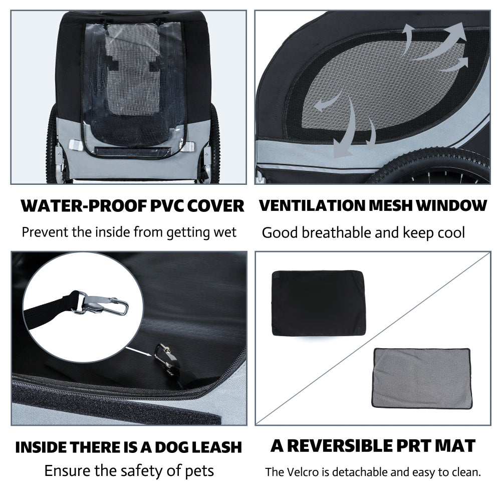 - All-Terrain Performance & Safety FeaturesGlide - The 20-inch pneumatic tires have been widened to 2.36 in, allowing this trailer to withstand larger loads and easily handle various complex road conditions.A waterproof PVC rain cover shields against rain, while reflective wheel strips boost visibility in low-light conditions. The roll-up front panel offers pets a clear view, turning every ride into a scenic adventure.