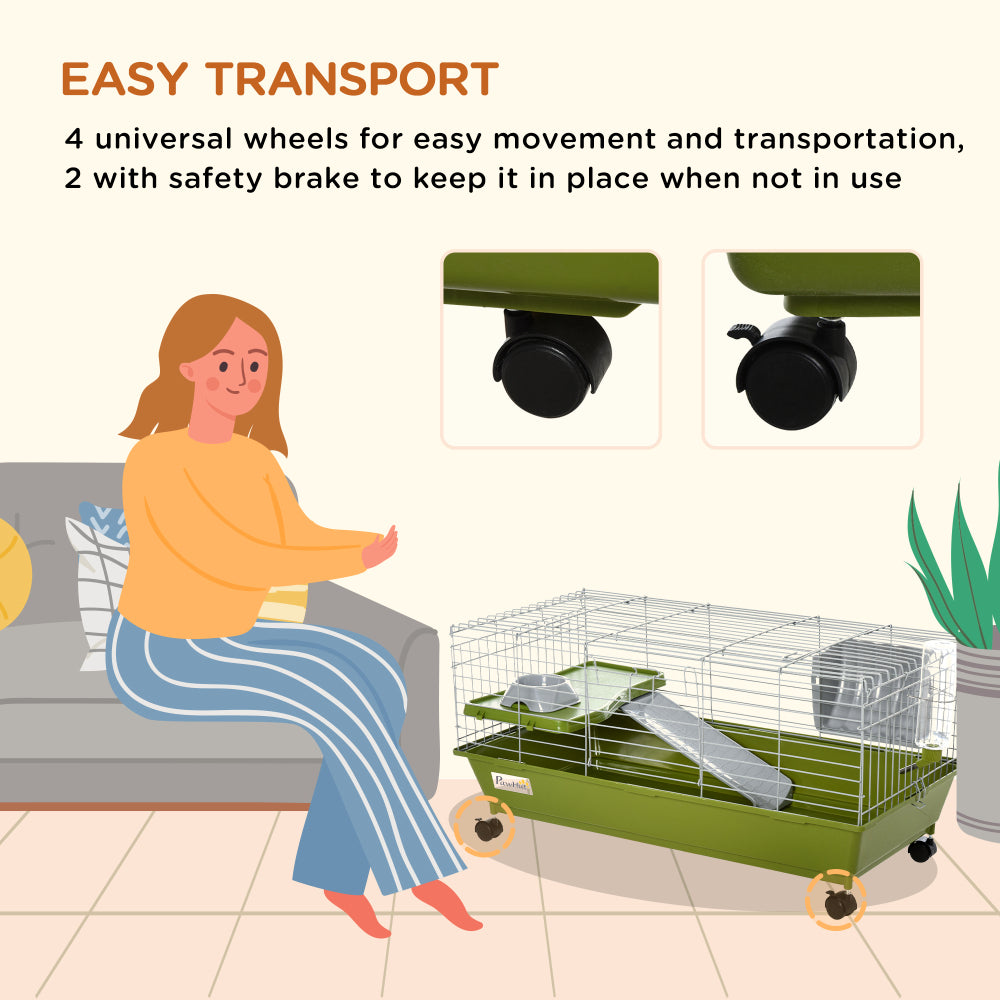 PawHut 35"L Small Animal Cage, Rolling Bunny Cage, Guinea Pig Cage with Food Dish, Water Bottle, Hay Feeder, Platform, Ramp for Ferret Chinchilla, Green