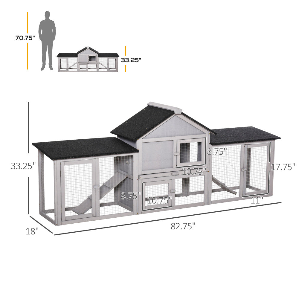 PawHut 83"L Outdoor Rabbit Hutch, Guinea Pig Cage Indoor Outdoor Wooden Bunny Hutch with Double Runs, Weatherproof Roof, Removable Tray, Ramps, Gray