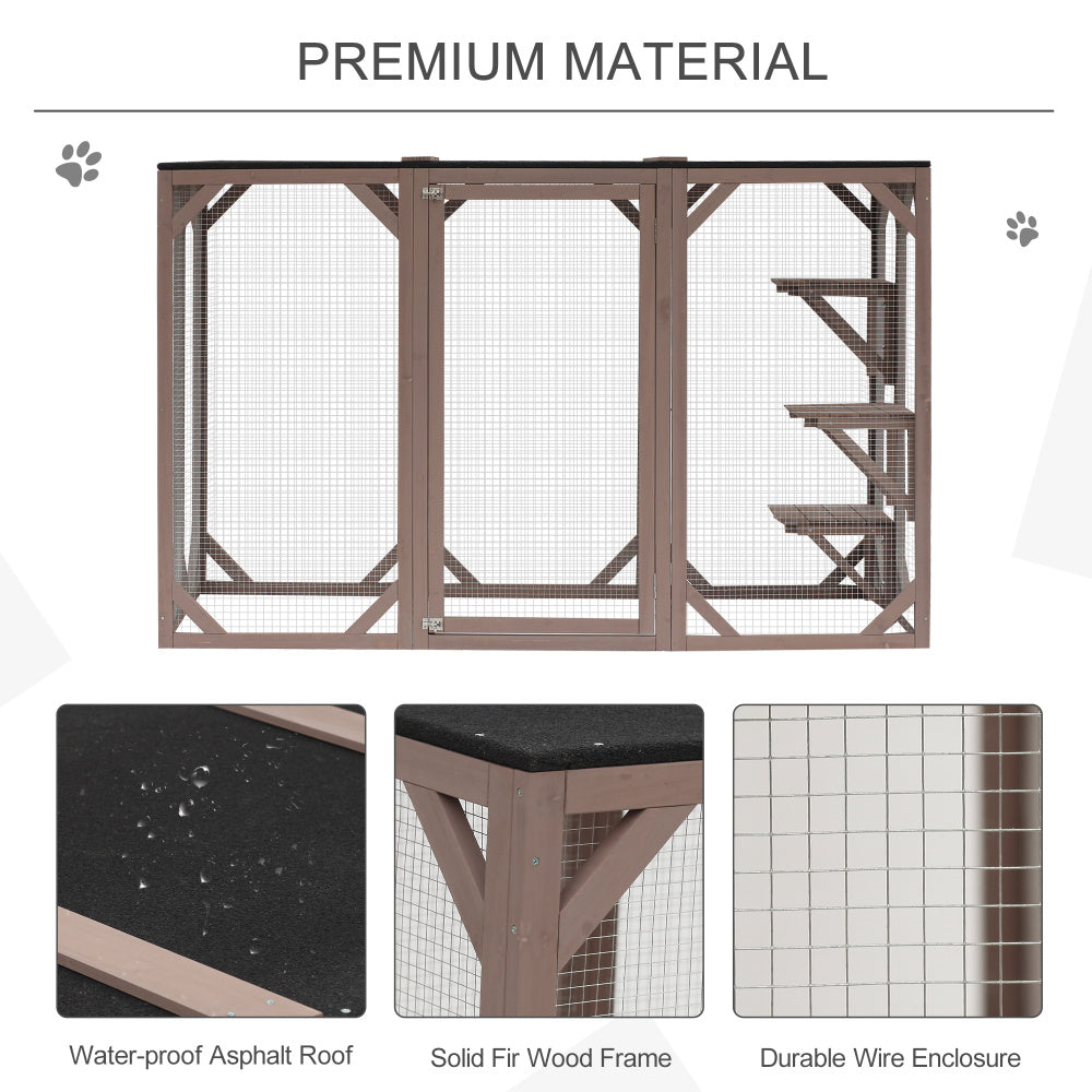 PawHut Outdoor Cat House, Catio Wooden Feral Cat Shelter, Cat Cage with Platforms, Large Enter Door, Weather Protection Asphalt Roof, 71" L, Brown