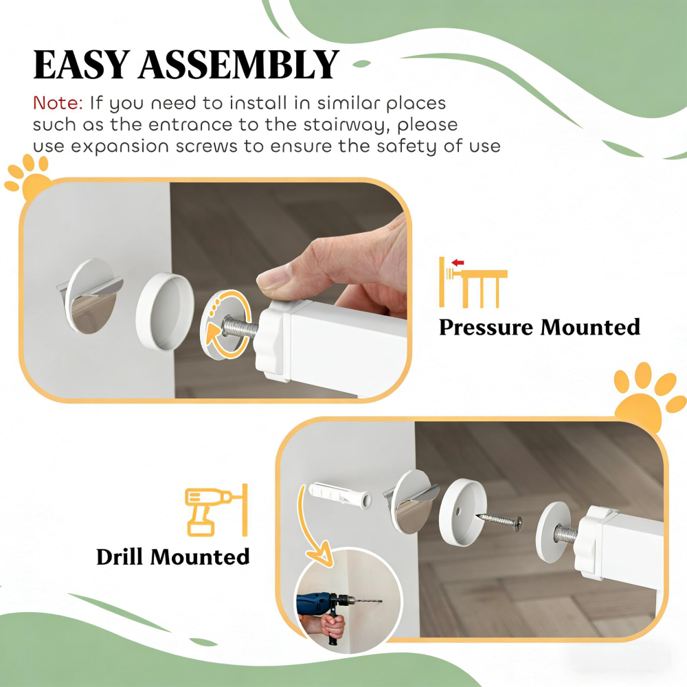- - Versatile Installation: Easily assembled and installed via pressure mounting or drilling, our pet gate offers flexibility without damaging walls.