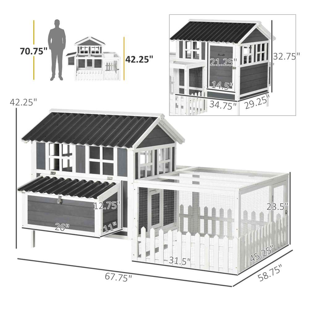 - Chicken Coop Kit Info: Overall Dimensions: 67.75" L x 58.75" W x 42.25" H. Main House: 34.75" L x 29.25" W x 32.75" H. Suitable for 3-4 chickens. Assembly required.