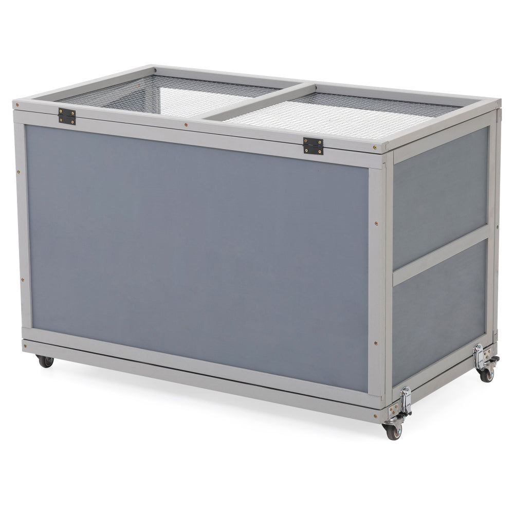 There is a plastic tray with a wooden frame at the bottom of the product, with a size of 900 * 500mm, and 4 metal swivel wheels are installed at the bottom of the tray.