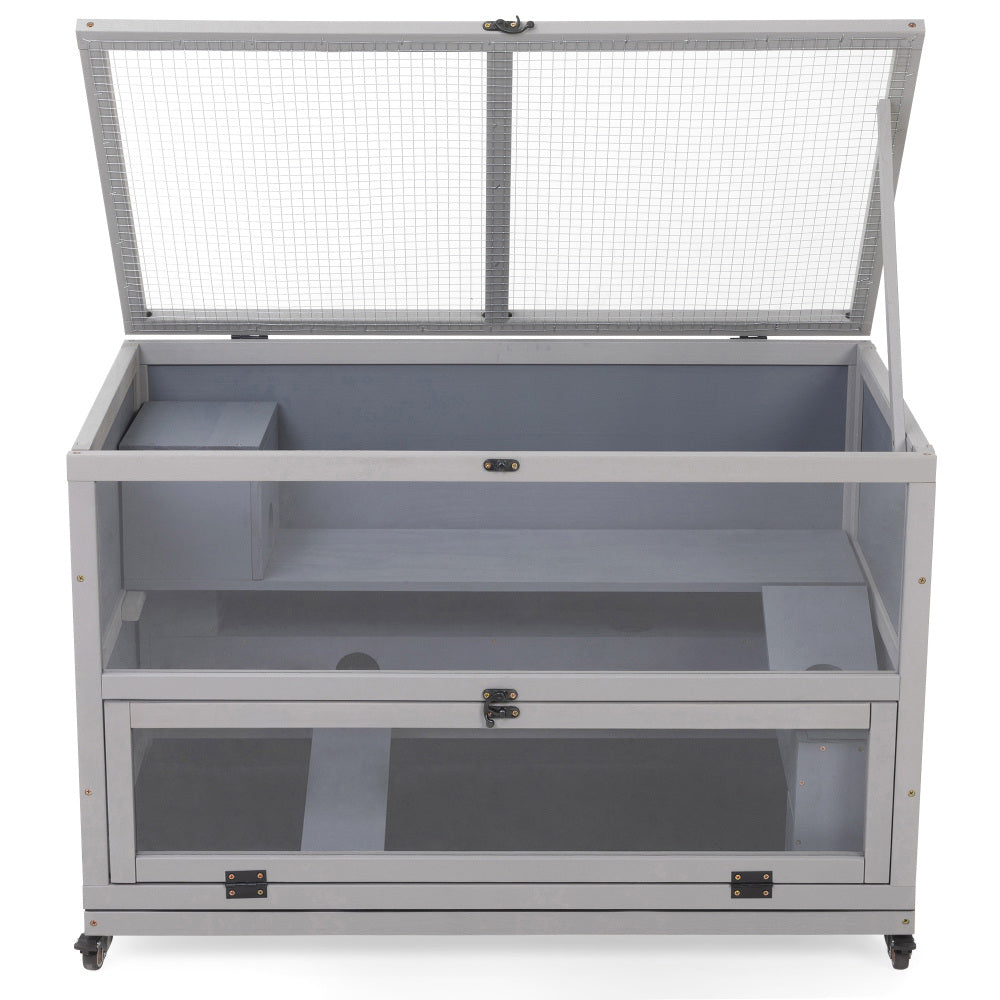 Wooden Hamster Cage, Gerbil Cage Enclosure with Tunnels, Detachable Tray, Wheels, Openable Top & Front, Small Animal Hutch for Mice, Rat, Gray