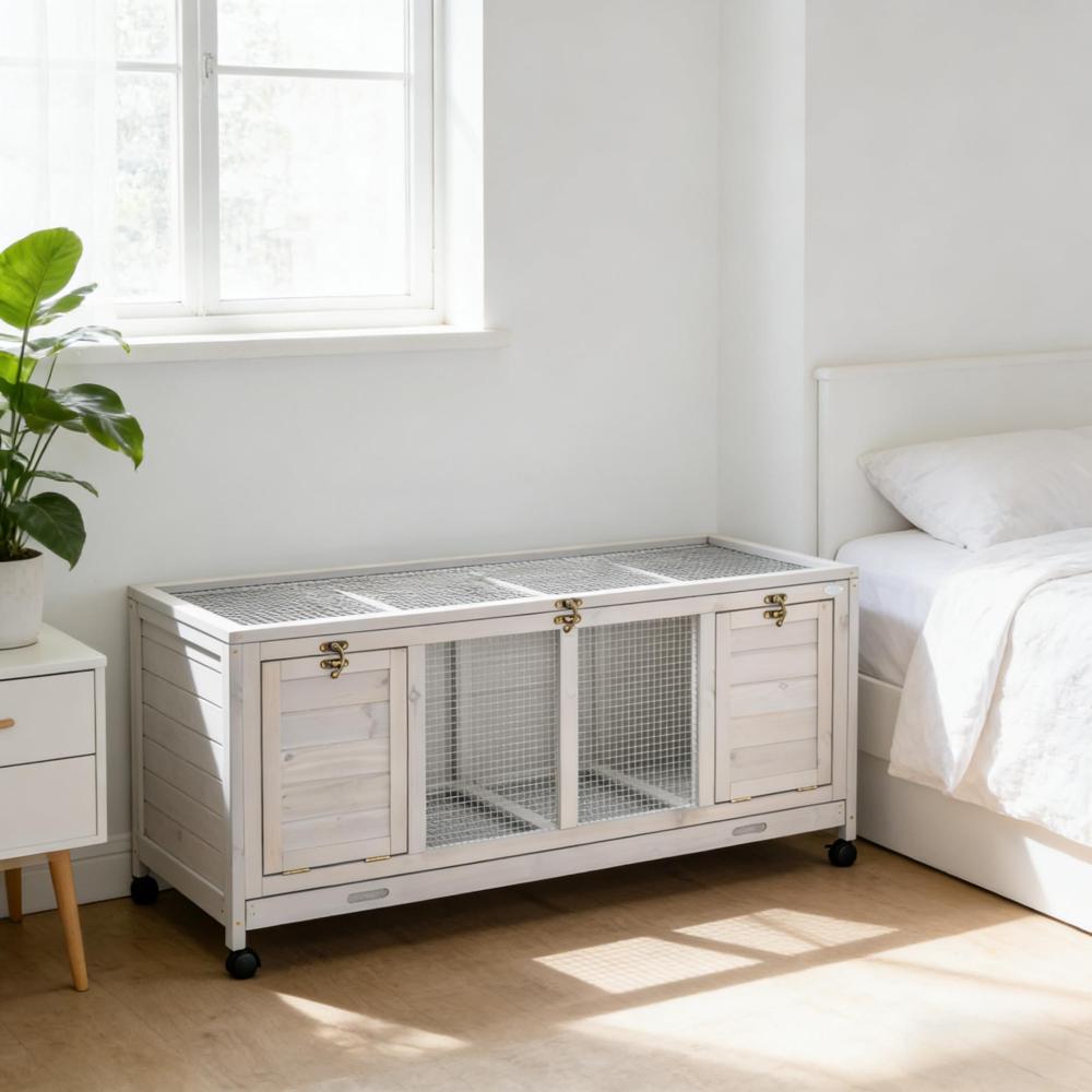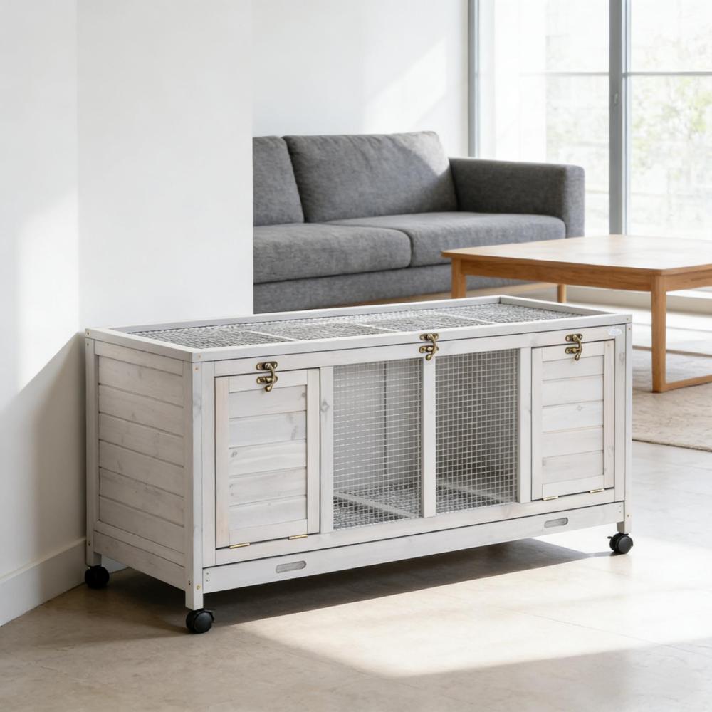 - - Mobile Cage: This bunny hutch is equipped with wheels. You can easily move it without effort, and two of the wheels can be locked to keep it in place.